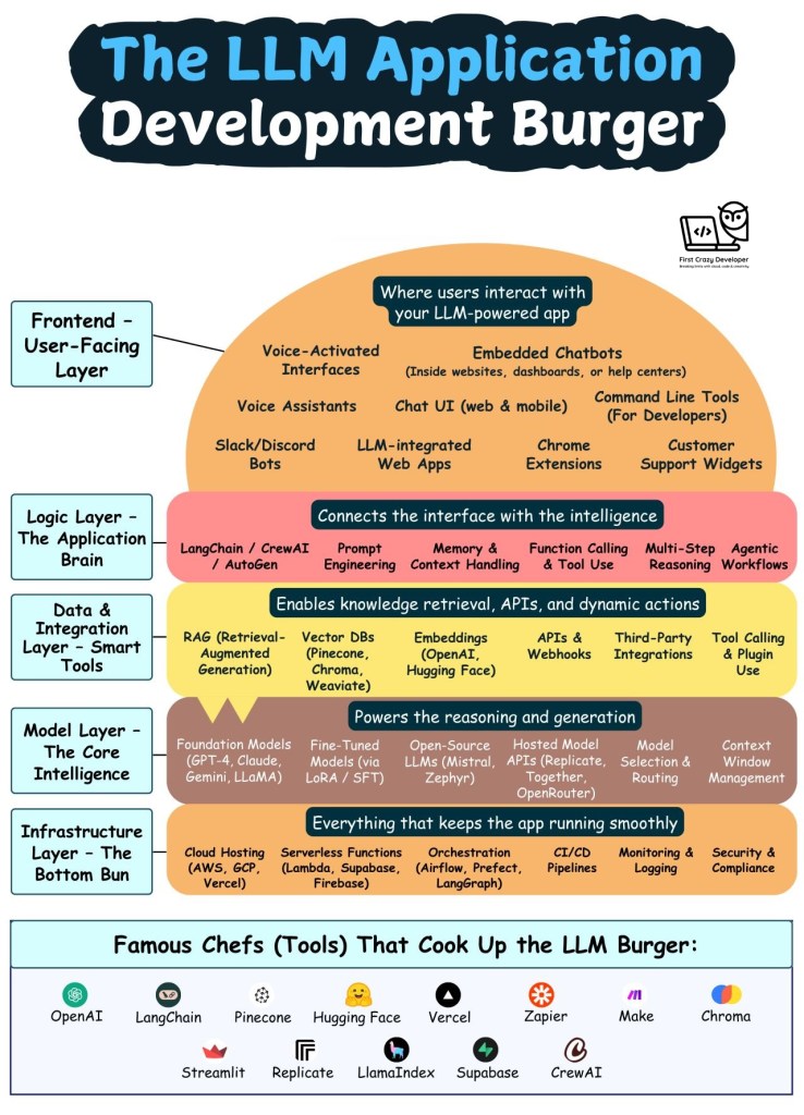 Just like a burger, every layer in your AI app matters—from the juicy intelligence in the middle to the user-friendly top bun. Let’s break down each layer of the “LLM Burger Stack” that powers intelligent applications today.
