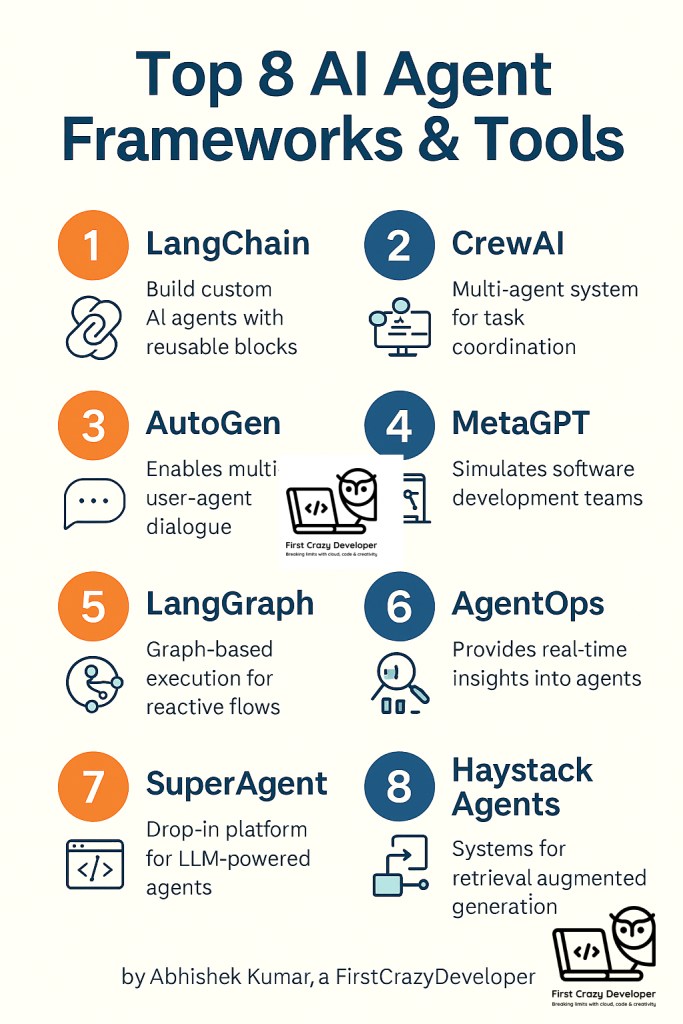 The world of AI agents is evolving rapidly. Whether you’re an AI hobbyist, developer, or tech lead building intelligent systems, understanding the right frameworks is critical. Here’s a simplified and structured blog that breaks down the top 8 AI Agent tools—each one enabling different capabilities like reasoning, memory, collaboration, and dialogue handling.