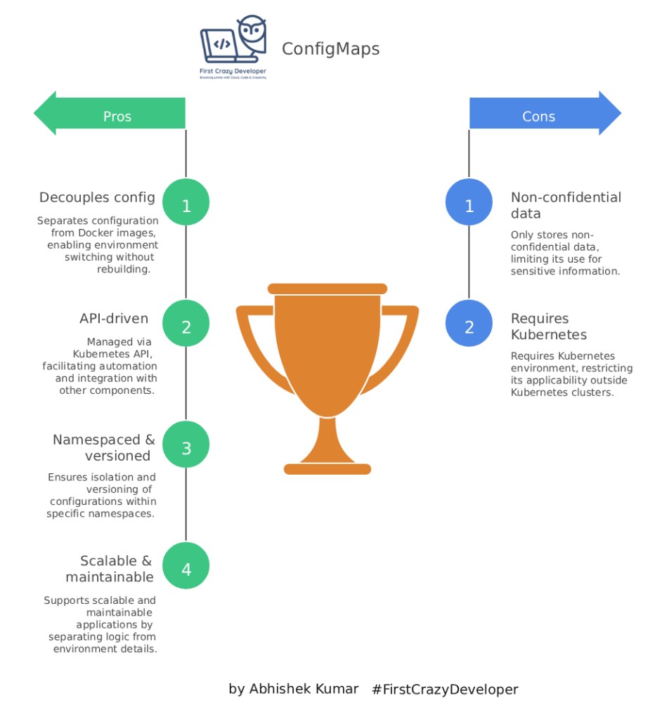 - β Decouples config from images β A key advantage of ConfigMaps is their ability to decouple application configuration from the Docker image itself. This means you can switch environments (e.g., from staging to production) without rebuilding the Docker image, promoting reusability and reducing build times.