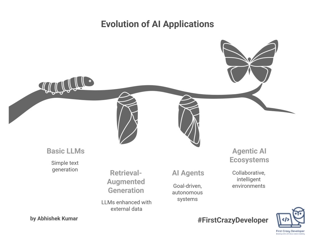 This blog is your step-by-step guide to understanding the practical evolution of AI—from simple LLMs to multi-agent ecosystems—and how you, as a developer, can start building at each level.