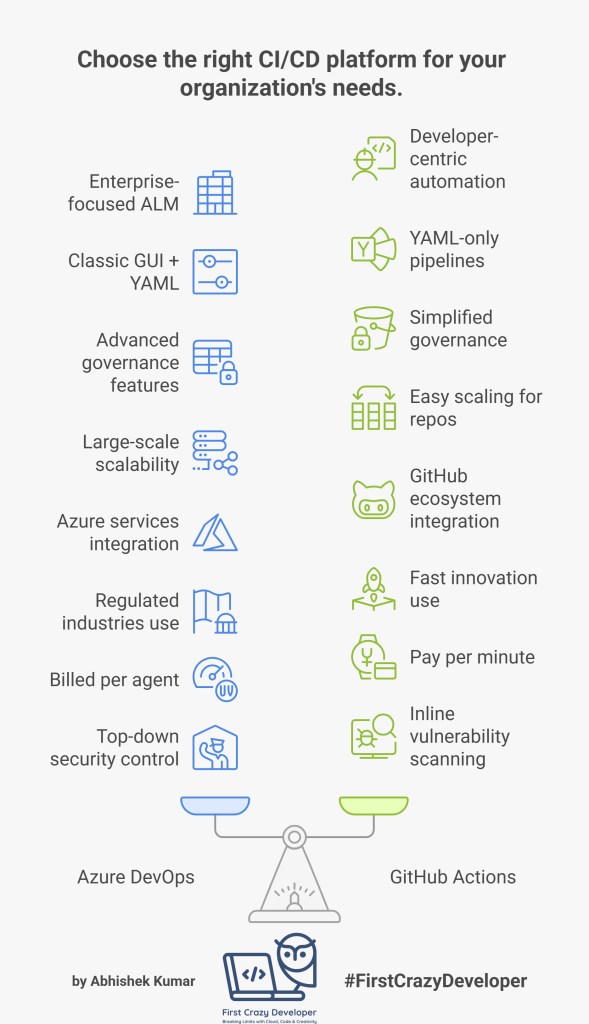 | Primary Purpose | End-to-end ALM (Boards, Repos, Pipelines, Artifacts) | Lightweight CI/CD automation for code in GitHub |