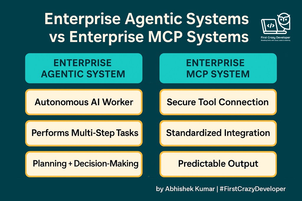 Together, they form the next generation of enterprise AI architecture.”#AI #AgenticAI #MCP #EnterpriseAI #AzureAI #OpenAI #AIDesign #AIArchitecture #DeveloperCommunity #TechLeadership #CloudArchitecture #FirstCrazyDeveloper #AbhishekKumar